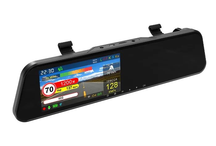 - Некоторые модели изготавливаются в виде зеркала заднего вида. С лицевой стороны у них большой дисплей, а с обратной встроена камера, которая снимает вид через лобовое стекло. На экран можно выводить картинку сразу с нескольких камер, что очень удобно для парковки и отслеживания обстановки сразу с разных сторон.