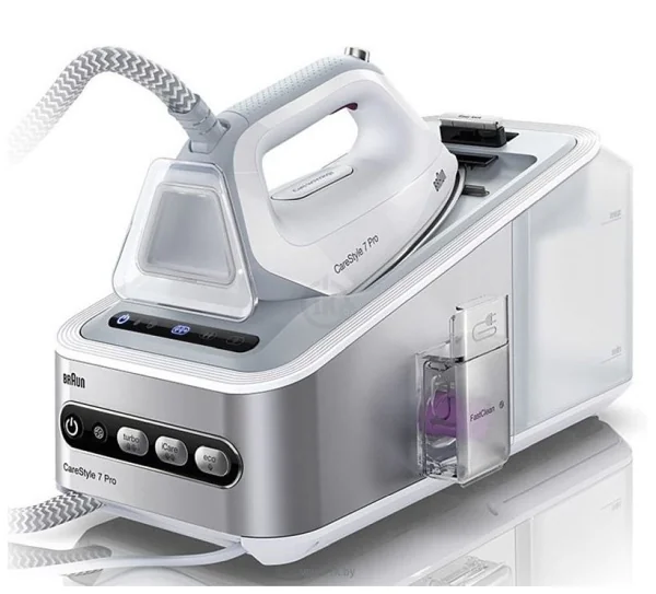 Braun IS 7155 WHДорогая паровая станция для тех, кому нужно за раз аккуратно разглаживать и отпаривать много одежды. Может работать в трех режимах — от очень аккуратного до сверхмощного с нагревом подошвы до 200 градусов Цельсия. Минусы — это, конечно же, высокая цена и необходимость выделения отдельного места для базовой станции. Особенности: