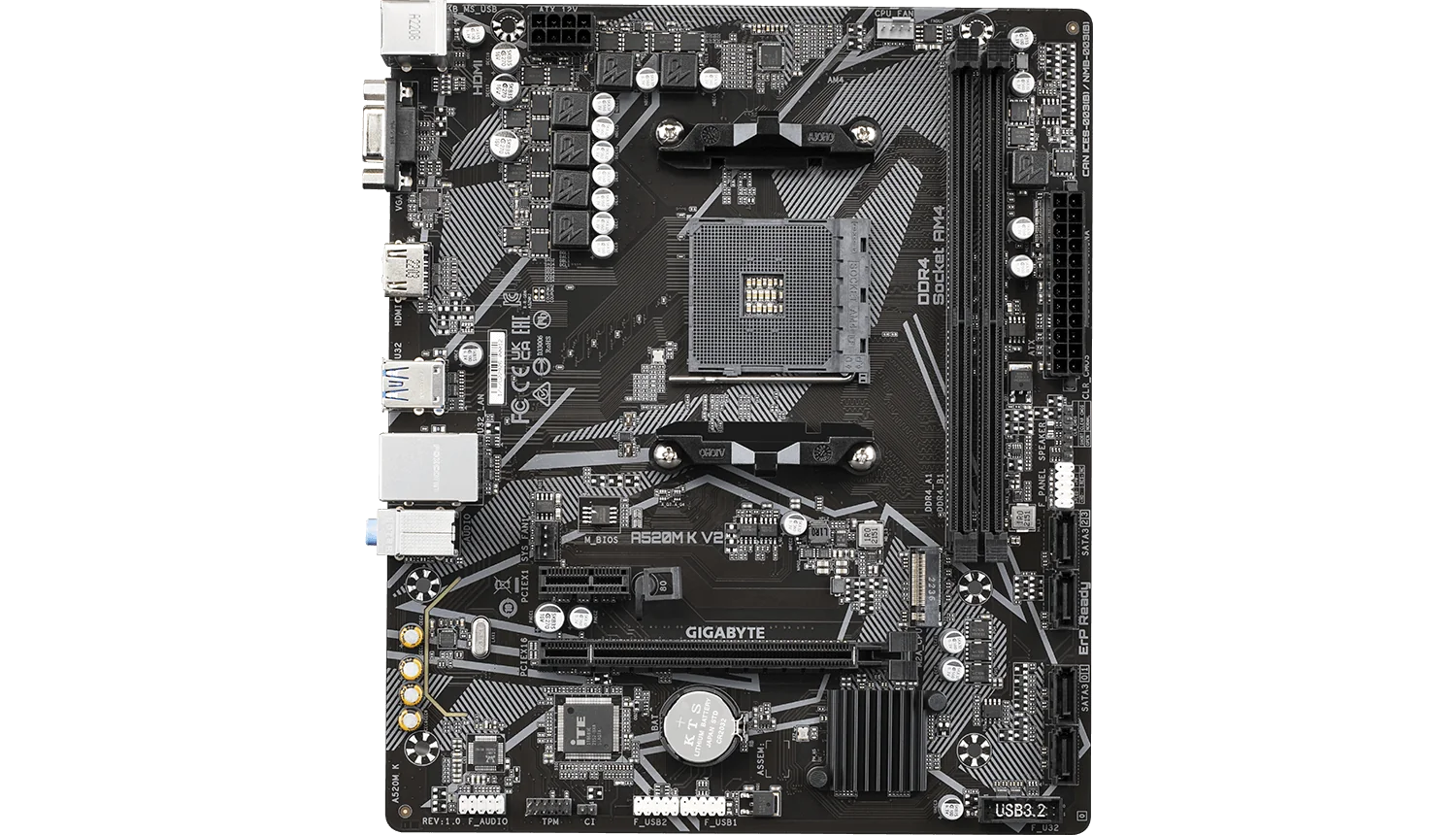 Бюджетная материнская плата формата MicroATX, предназначенная для процессоров AMD с сокетом AM4. Плата оснащена двумя слотами для оперативной памяти DDR4 с максимальным объемом до 64 ГБ и частотой до 5100 МГц. Для хранения данных доступны четыре порта SATA 3.0 и один слот M.2 для SSD. Есть два слота PCIe 3.0 (16х и 1х), а также базовые интерфейсы ввода-вывода для периферии: USB, PG/2, VGA, HDMI, jack 3.5. Поддержка встроенной графики пригодится, если вы собираете самый простой ПК ребенку для учебы или родителям для видеосвязи и интернет-серфинга.