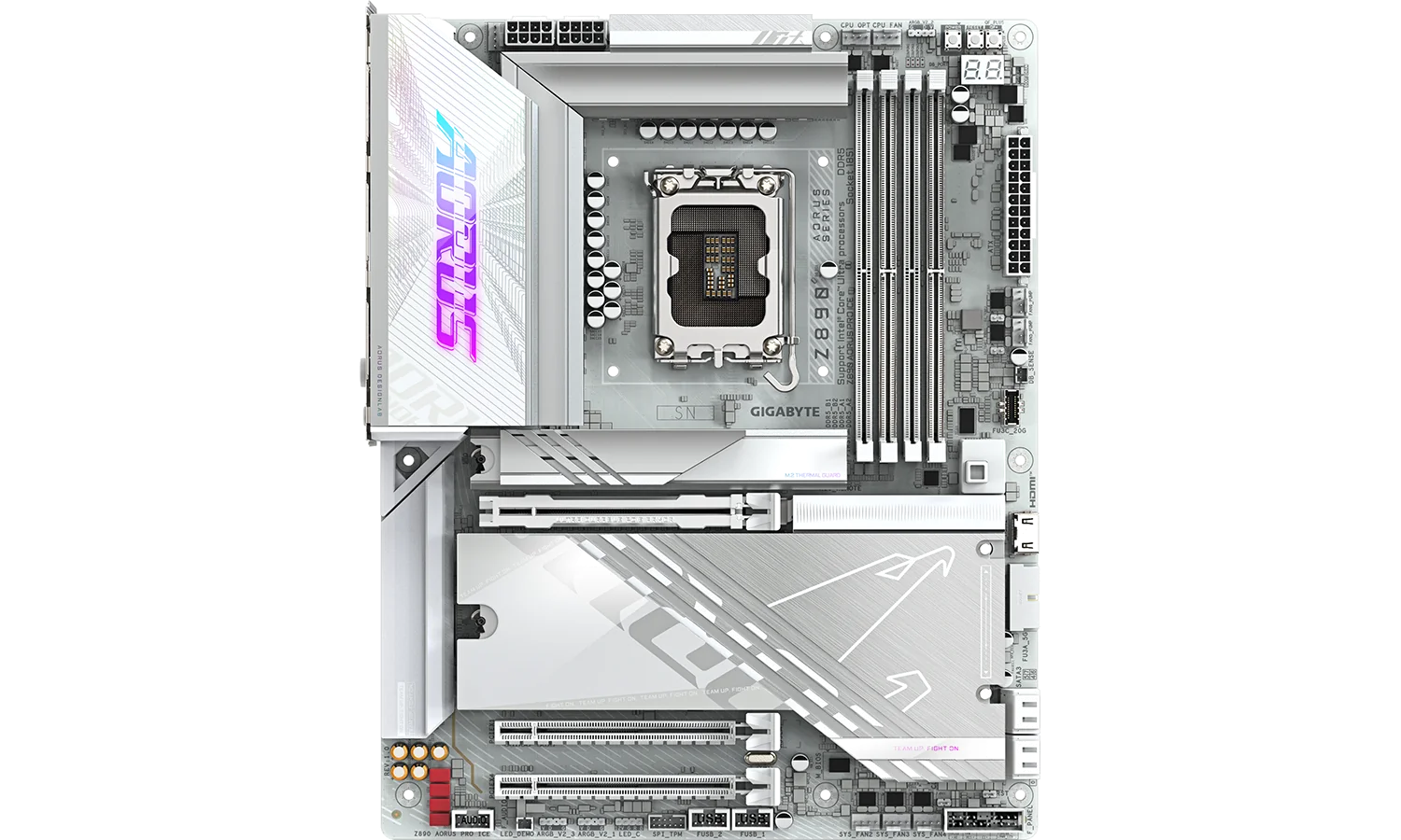 Aorus Pro Ice – это высококлассная материнская плата от компании Gigabyte, базирующаяся на чипсете Intel Z890. Если решили сделать долгоиграющую сборку под новенькие процессоры Intel, то эта «материнка» как раз для вас. Кроме того, она оснащена четырьмя слотами для оперативной памяти DDR5 с максимальной частотой до 9500 МГц и объемом до 256 ГБ. Здесь есть три слота PCIe 5.0 16х, целых пять разъемов M.2 плюс четыре SATA-порта. Также плата поддерживает новейшие беспроводные стандарты Wi-Fi 7 и Bluetooth 5.4. Высокую скорость передачи данных гарантирует Ethernet 5 Гбит/с. Портов USB здесь десять и еще два разъема Thunderbolt 4. Плата создана для работы с самыми требовательными задачами.