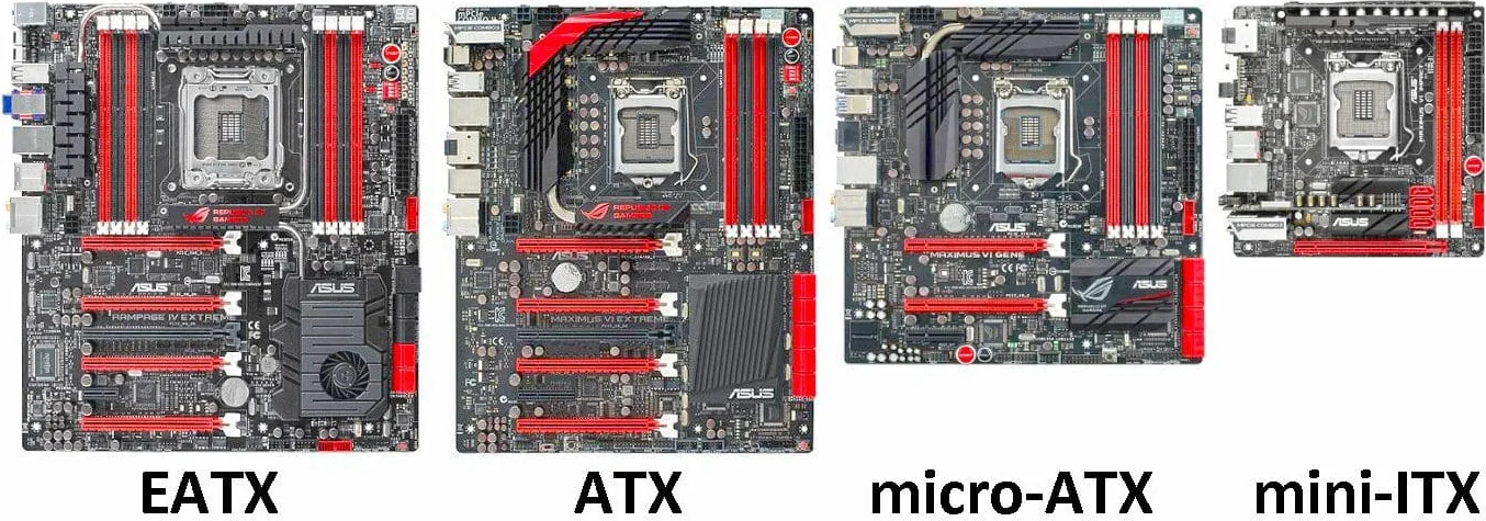 - EATX (30.5×33 см) – увеличенный формат ATX, предназначенный для высокопроизводительных систем: рабочих станций, серверных ПК. Имеет больше слотов расширения и улучшенное охлаждение. Обычному пользователю в такой плате нет необходимости, функциональности обычной ATX вполне хватит.