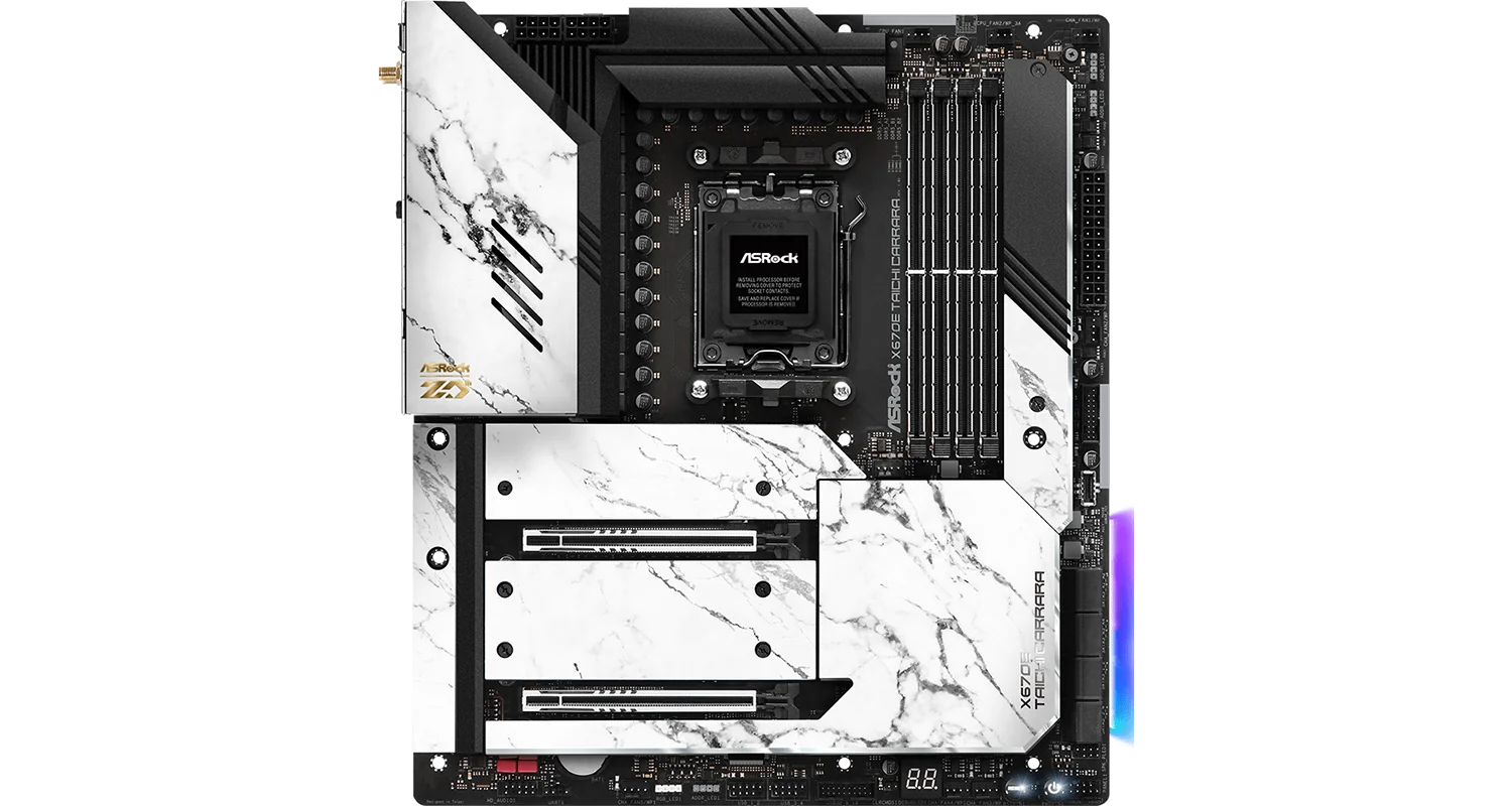 Taichi Carrara– это топовая материнская плата формата EATX с чипсетом AMDX670E, предназначенная для процессоров с сокетом AM5. Она имеет 24+2+1 фаз питания с мощными радиаторами – перегреть такую плату будет непросто. «Материнка» поддерживает до 192 ГБ оперативной памяти DDR5, для хранения доступны четыре слота M.2 и восемь портов SATA. Из интерфейсов тут есть Wi-Fi 6E, Bluetooth, LAN 2,5 Гбит/с. Дополнительно она поддерживает RGB-подсветку, а радиаторные панели стилизованы под мрамор.